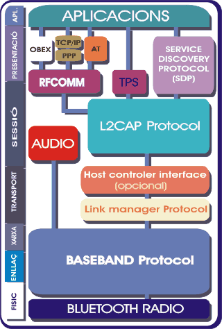 Radio protocol (RF) BaseBand Protocol Link Manager Protocol Logical Link Control and Adaptation Protocol Service Discovery Protocol RFCOMM TPS